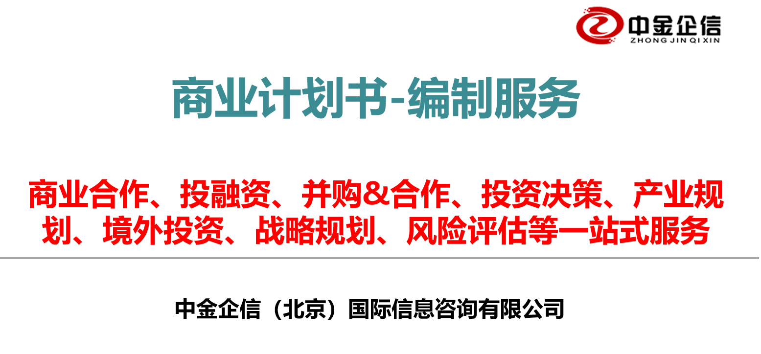 4)项目可行性报告&商业计划书专业权威编制服务机构-中金企信国际咨询:集13年项目编制服务经验为各类项目立项、投融资、商业合作、贷款、批地、并购&合作、投资决策、产业规划、境外投资、战略规划、风险评估等提供项目可行性报告&商业计划书编制、设计、规划、咨询等一站式解决方案。助力项目实施落地、提升项目单位申报项目的通过效率。