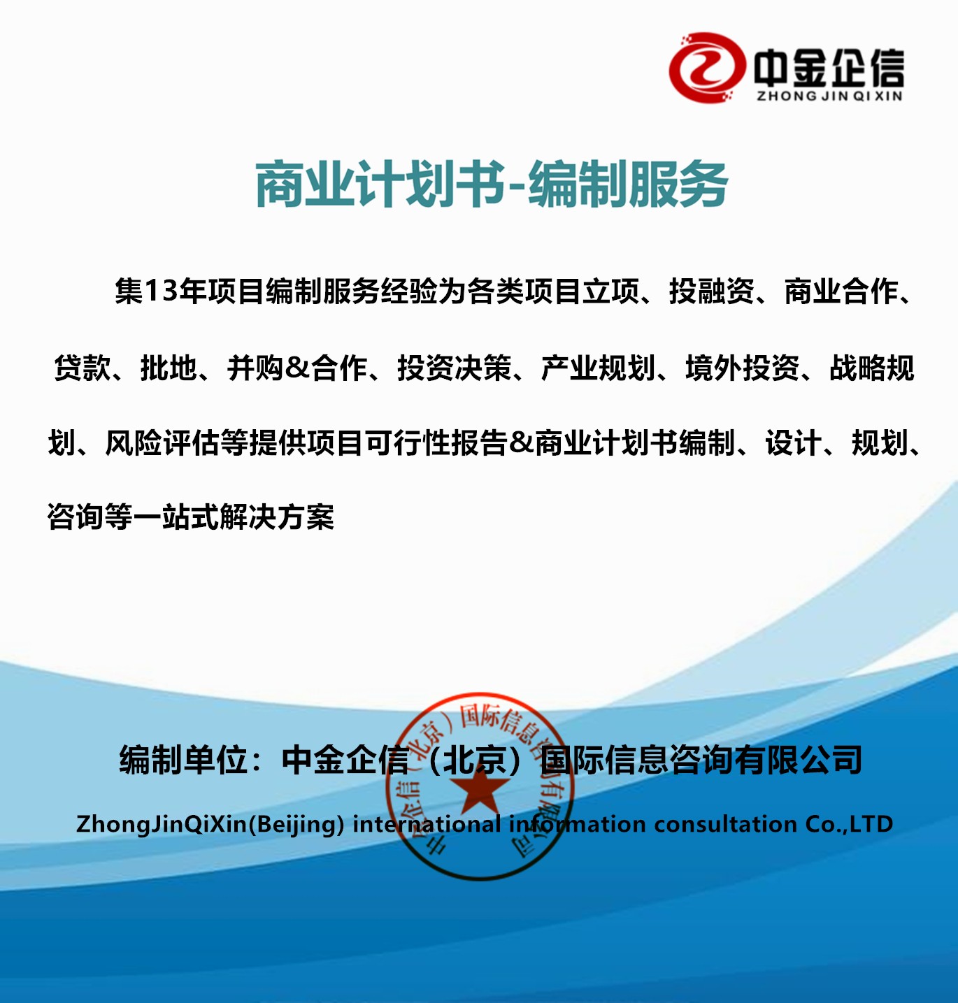 4)项目可行性报告&商业计划书专业权威编制服务机构-中金企信国际咨询:集13年项目编制服务经验为各类项目立项、投融资、商业合作、贷款、批地、并购&合作、投资决策、产业规划、境外投资、战略规划、风险评估等提供项目可行性报告&商业计划书编制、设计、规划、咨询等一站式解决方案。助力项目实施落地、提升项目单位申报项目的通过效率。